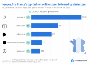 La tienda en línea líder en Francia en el segmento de la moda en 2021 fue veepee.fr. La moda francesa generó unas ventas netas totales de 1.600 millones de euros en su mercado local en 2021. Ocupa un claro primer puesto con una gran ventaja, pero recuerda una ligera disminución de las ventas netas del -5 % en comparación con 2020. Segundo shein.com, que actualmente se está disparando en varios países del mundo, presenta un crecimiento interanual más que impresionante en comparación: tras un aumento del 58 %, shein.com registró ventas netas totales en 2021 de 841 millones de euros en 2021 Los rangos 3 a 5 mostraron un crecimiento más lento y, por lo tanto, es probable que pierdan más terreno frente a shein.com en los años siguientes.