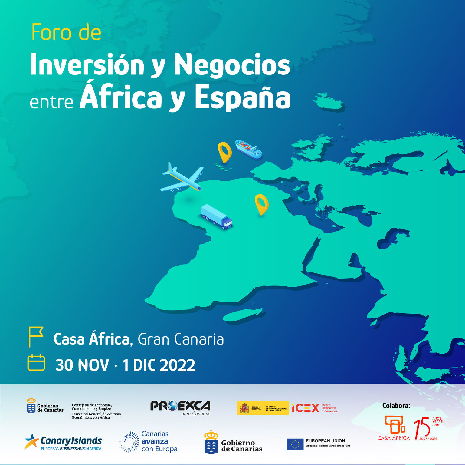 El próximo 30 de noviembre hasta el 1 de diciembre tendrá lugar este foro, organizado por la Consejería de Economía, Conocimiento y Empleo del Gobierno de Canarias, a través de la Dirección General de Asuntos Económicos con África y PROEXCA, en colaboración con el Ministerio de Industria, Comercio y Turismo de España, ICEX y Casa África, pretende realzar el compromiso de España y de Canarias con África y contribuir a la identificación y desarrollo de iniciativas concretas en los sectores económicos de mayor interés.